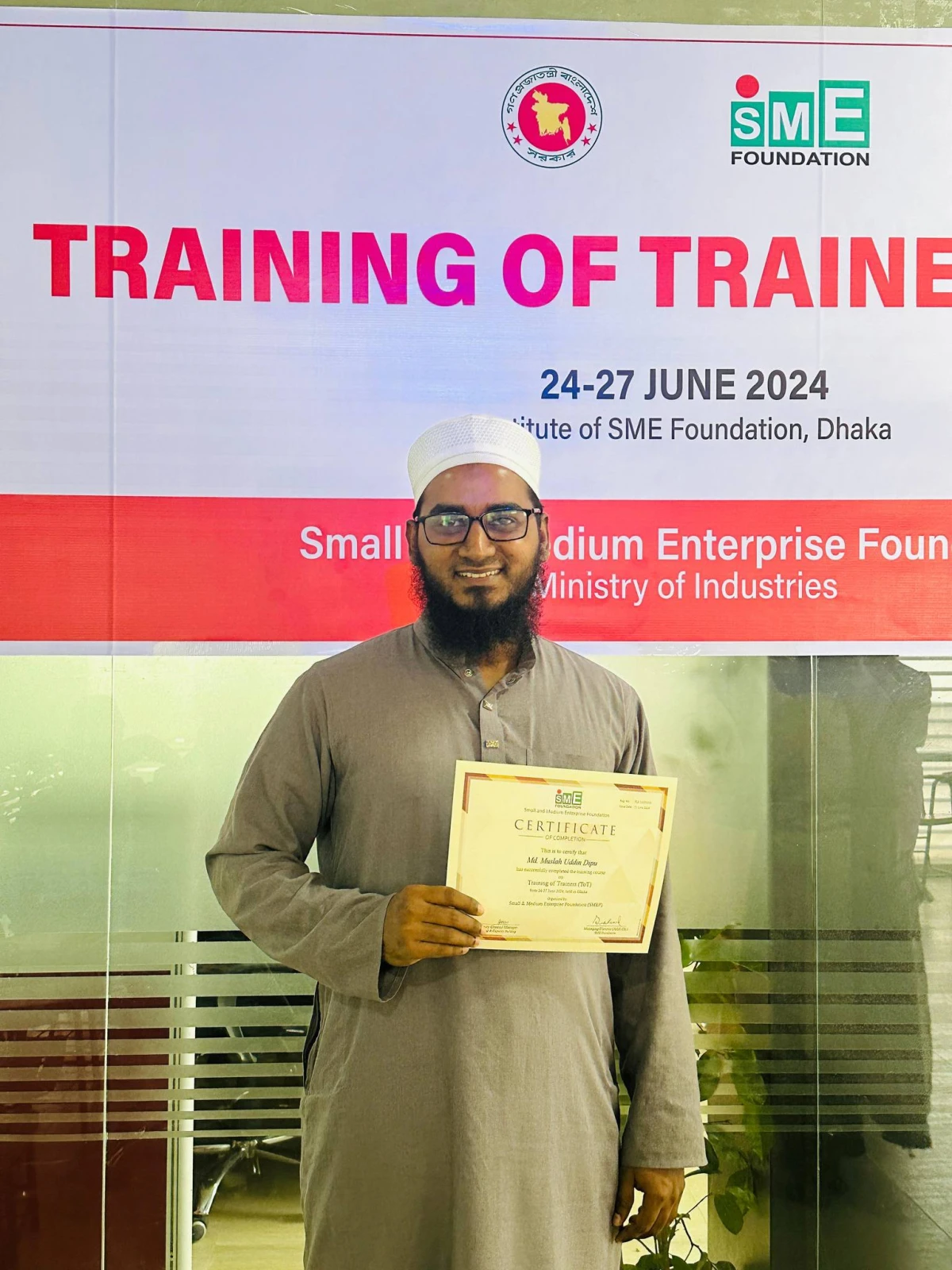 ২৪-২৭ জুন ২০২৪ এসএমই ফাউন্ডেশনের উদ্যোগে ঢাকায় ইনস্টিটিউট অব এসএমই ফাউন্ডেশনে ‘ট্রেনিং অব ট্রাইনার’ প্রশিক্ষণে বিডিস্কিল.ওআরজি এর প্রতিষ্ঠাতা জনাব মোঃ মোসলেহ উদ্দিন দিপু সফলতার সাথে অংশগ্রহণ করেন।